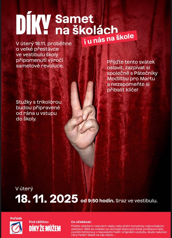 Budeme rádi, pokud do svého outfitu tento den zahrnete jakýkoli kus oděvu v barvě vlajky nebo přijdete v dobovém oblečení, ale není to podmínkou ;-). Před výukou a během první přestávky budou ve vestibulu k vyzvednutí stužky s trikolórou. O velké přestávce se ve vestibulu sejdeme, zazpíváme si spolu s Pátečníky Modlitbu pro Martu (díky p. prof. Paličkovi), zazvoníme klíči a můžeme udělat podobný živý řetěz, který tvořili lidé na Masarykově náměstí v listopadu 1989 (v návaznosti na vzpomínku prof. Skotnicové).