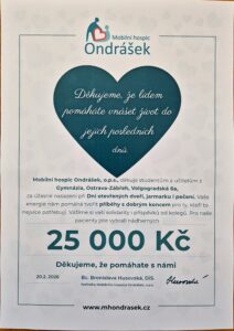 Společně se tak podařilo podpořit organizaci, která pomáhá lidem v závěrečné fázi života prožít jejich poslední chvíle důstojně a především doma v blízkosti své rodiny. Náš dar může přispět k úhradě péče o jednoho klienta.