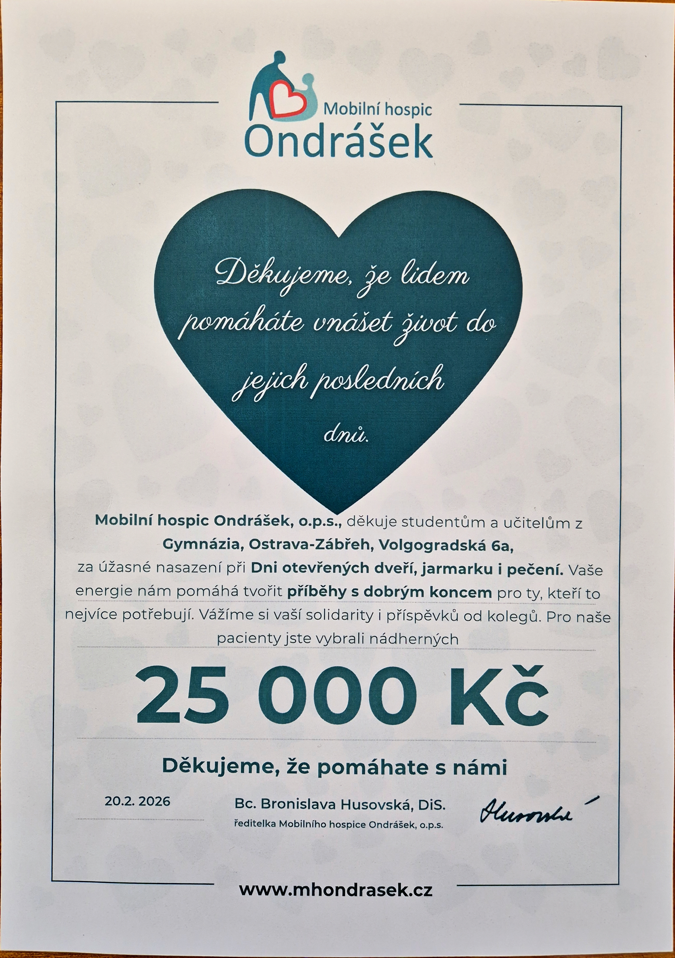 Tato částka je výsledkem společného úsilí studentů i učitelů. Zapojili jsme se do dobrovolného pečení, jehož produkty se prodávaly během letošních Dnů otevřených dveří na naší škole. Další část výtěžku pocházela z vánočního jarmarku, kde se prodával punč, a také ze školní akce Odpad poklad, při které žáci přinesli hračky, knihy a další věci, jež už nepotřebovali, ale tyto mohly udělat a snad i udělaly radost někomu dalšímu.
