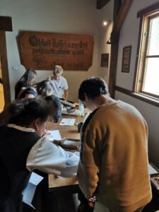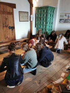 Ve třídě ze 17. století nás uvítala dobově oblečená lektorka, která nám předvedla nespočet věcí nezbytných k chodu školy té doby, kupříkladu jak se vyráběl inkoust z duběnek. Paní nás také pohanila za to, co se v dnešní době nosí. Běda! Nikdo neměl dlouhou suknici či čepec, místo toho potrhané kalhoty z džínoviny.