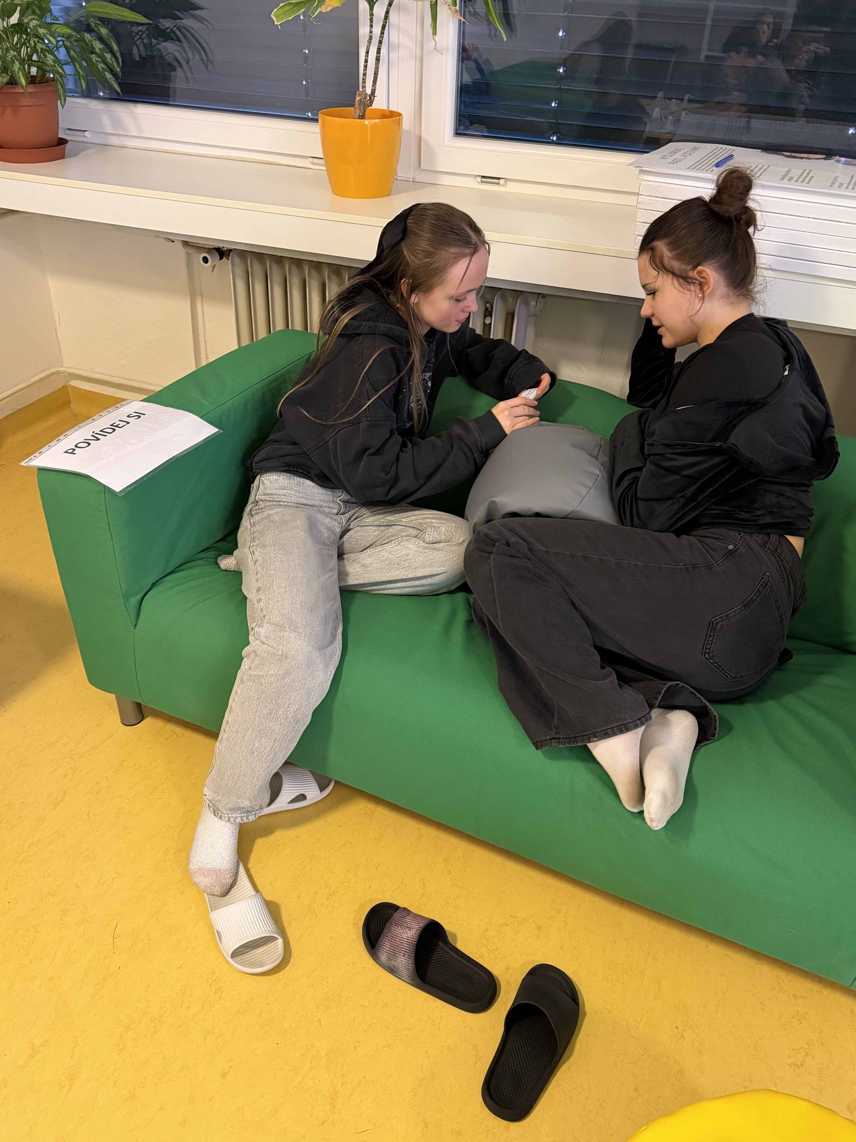 Každý žák si otestoval čtyři z nabízených činností a na závěr zhodnotil, u které se cítil nejlépe a která mu nejvíce pomohla se odreagovat. A která aktivita zvítězila? To se nedá jednoznačně říct – každému totiž pomáhá něco jiného. Ve zpětné vazbě se ale nejčastěji objevovala tři slova: pohoda, odpočinek a zábava.